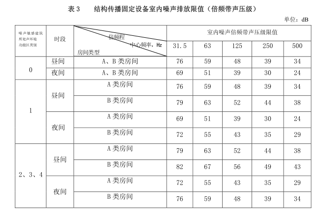 當(dāng)固定設(shè)備排放的噪聲通過(guò)建筑物結(jié)構(gòu)傳播至噪聲敏感建筑物室內(nèi)時(shí),噪聲敏感建筑物室內(nèi)等效聲級(jí)不得超過(guò)表 2 和表 3 規(guī)定的限值。