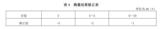 5.7.1 噪聲測(cè)量值與背景噪聲值相差大于 10dB (A) 時(shí),噪聲測(cè)量值不做修正。5.7.2 噪聲測(cè)量值與背景噪聲值相差在 3dB (A) ~10dB (A) 之間時(shí),噪聲測(cè)量值與背景噪聲值的差值取整后,按表 4 進(jìn)行修正。5.7.3 噪聲測(cè)量值與背景噪聲值相差小于 3dB (A) 時(shí),應(yīng)采取措施降低背景噪聲后,視情況按 5.7.1或 5.7.2 執(zhí)行;仍無(wú)法滿足前二款要求的,應(yīng)按環(huán)境噪聲監(jiān)測(cè)技術(shù)規(guī)范的有關(guān)規(guī)定執(zhí)行。