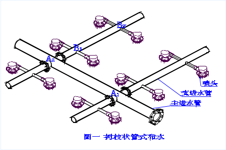 逆流冷卻塔循環(huán)水系統(tǒng)的布水方式采用管式布水,呈樹枝狀,循環(huán)水先進(jìn)入主管,然后進(jìn)入支管,再進(jìn)入噴頭,主管、支管、噴頭相互垂直,如圖一。根據(jù)流體狀態(tài)方程:壓力(P)×流速(V)=常數(shù)(K),循環(huán)水從主管流經(jīng)A1點、A2點后,到達(dá)主管末端,由于冷卻塔布水需要主管末端是封閉的,因此流速(V)急劇下降,壓力(P)急劇上升,所以A2處比A1處水壓頭大,同理B2處比B1處水壓頭大,綜上分析各布水噴頭處的水壓頭不相